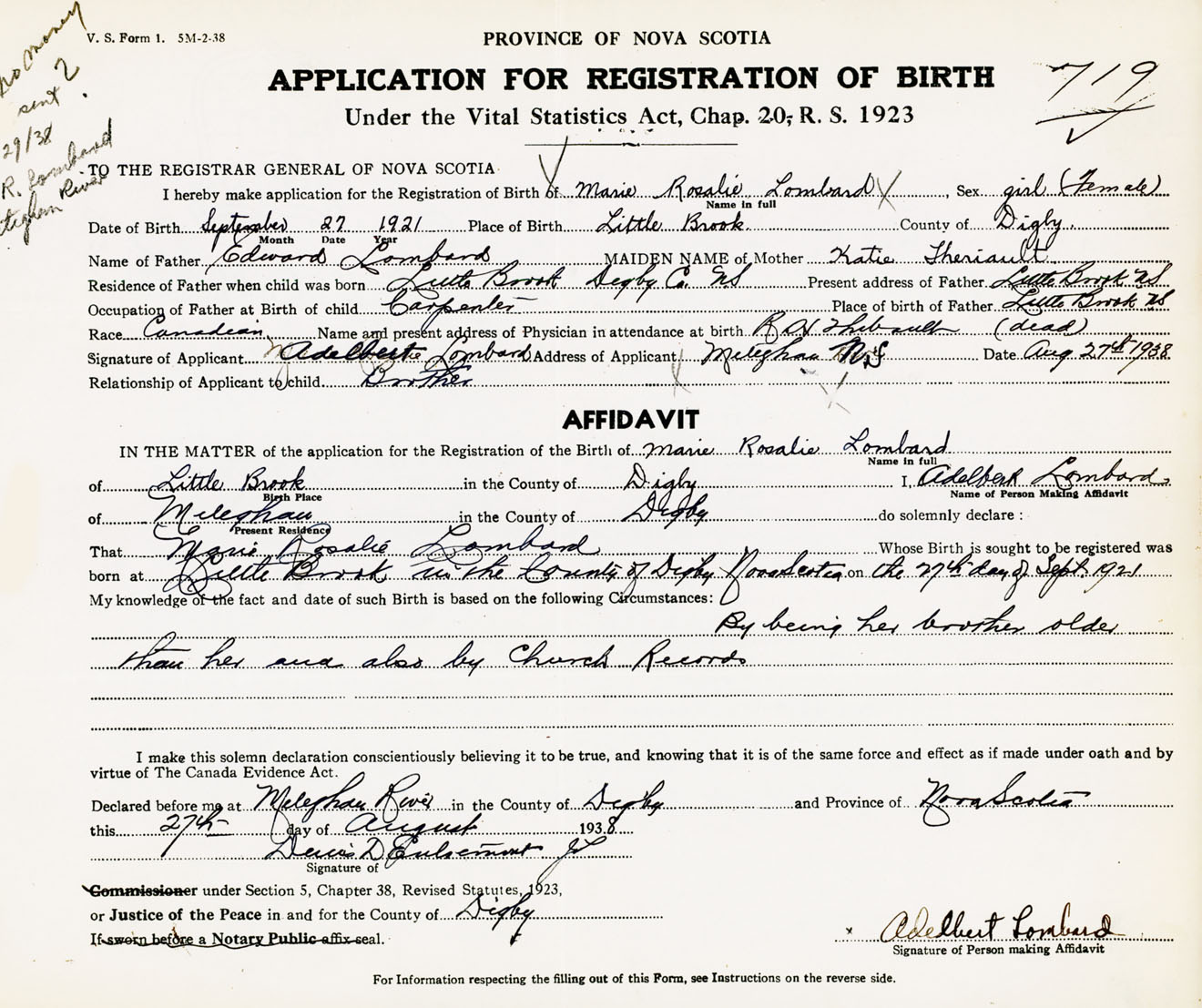 I hereby make application for the Registration of Birth of Marie RosalieLombard Sex Female
