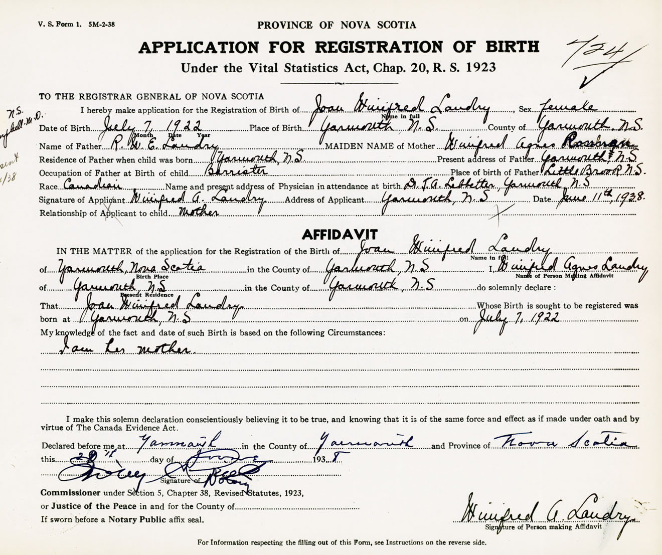 Signature of Applicant Winifred A. Landry Address of Applicant Yarmouth, NS Date 11 June 1938