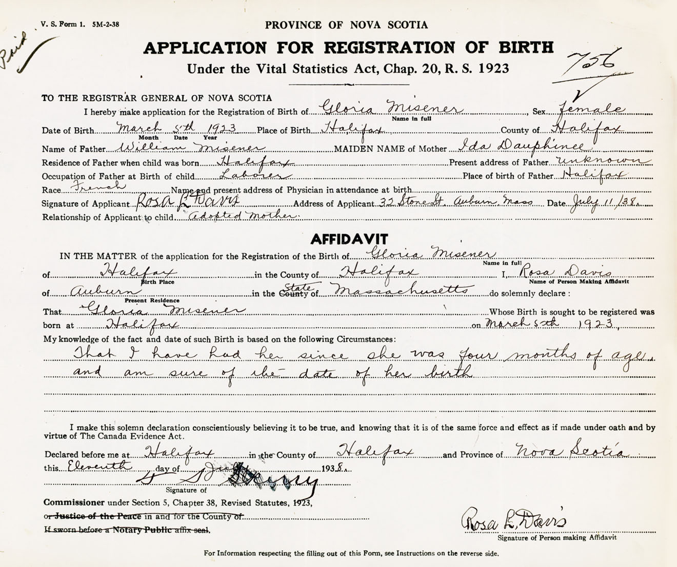 I hereby make application for the Registration of Birth of GloriaMisener Sex Female