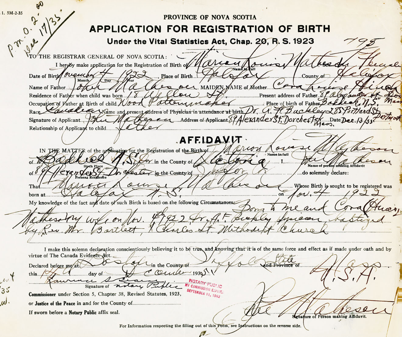Signature of Applicant John Matheson Address of Applicant 89 Alexander Street, Dorchester, Massachusetts, USA Date 13 December 1935