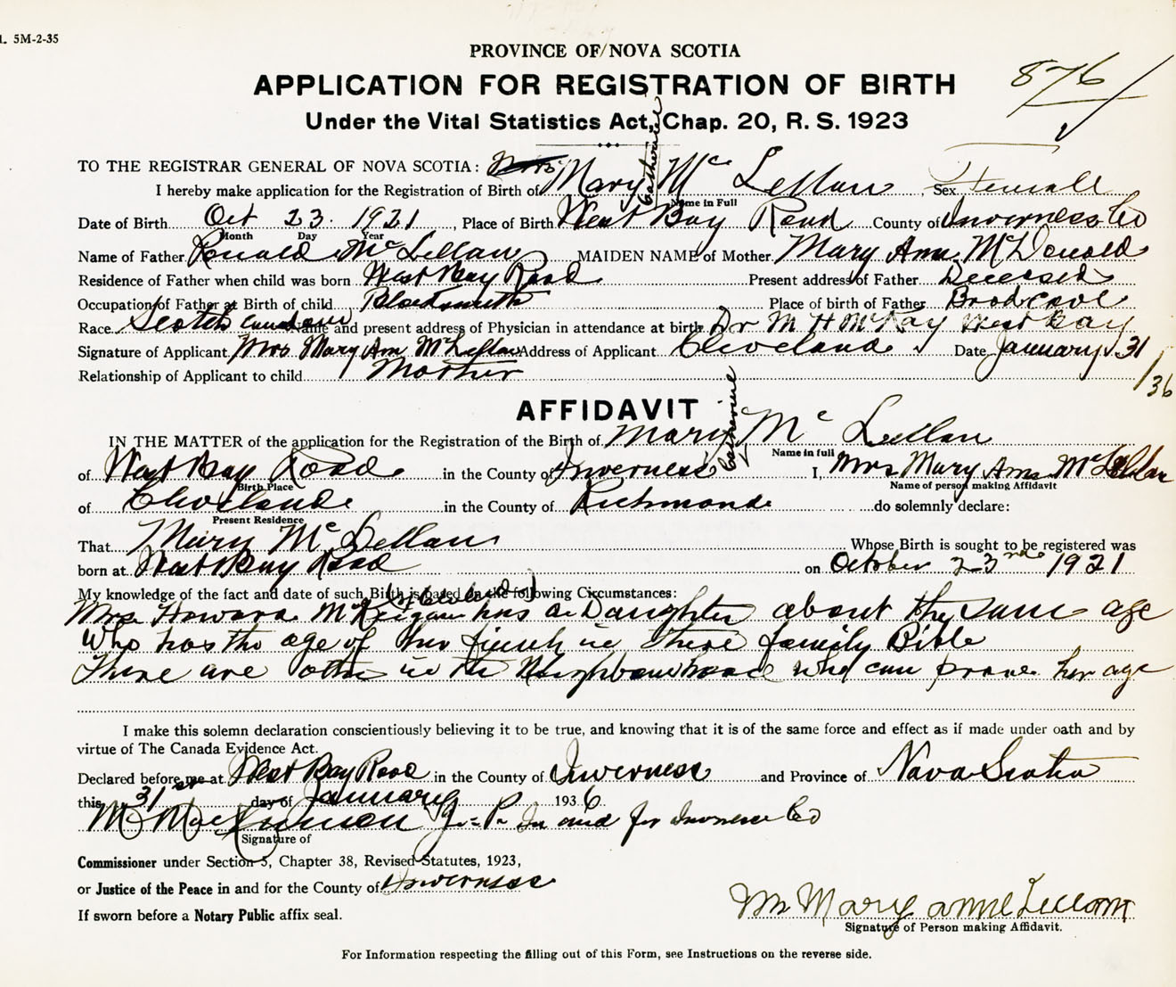 Signature of Applicant Mrs. Mary Ann McLellan Address of Applicant Cleveland, Richmond Co., NS Date 31 January 1936