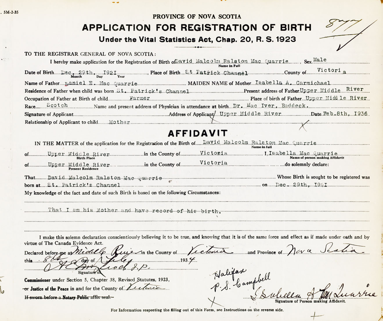 Signature of Applicant Isabella MacQuarrie Address of Applicant Upper Middle River, Victoria Co., NS Date 8 February 1936