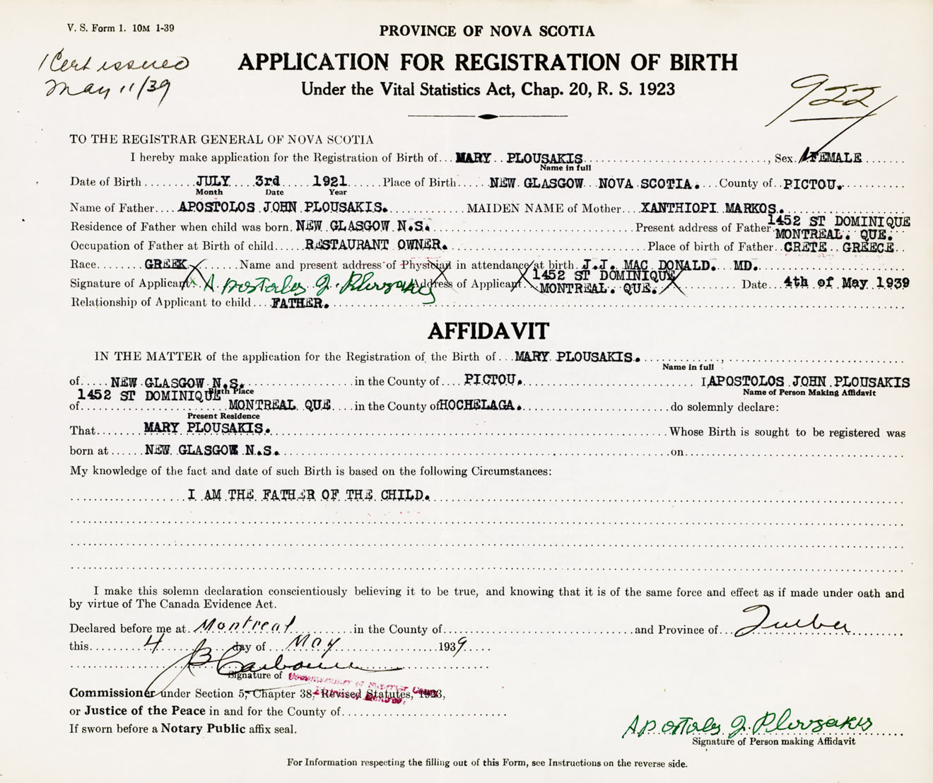 I hereby make application for the Registration of Birth of MaryPlousakis Sex Female