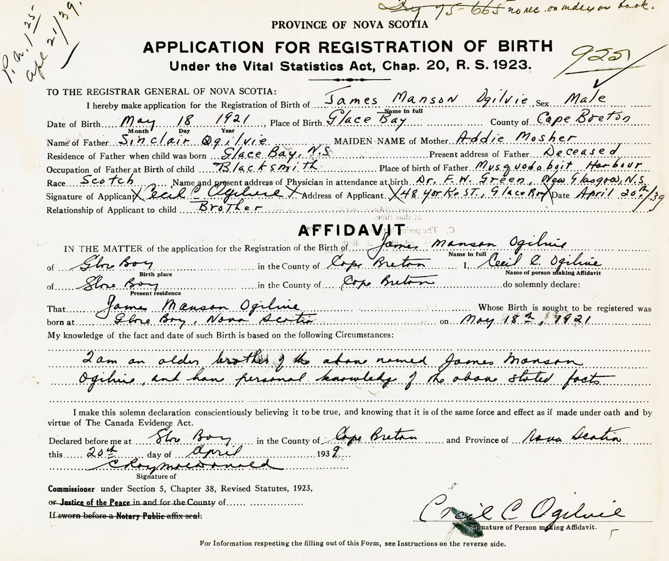 Signature of Applicant Cecil C. Ogilvie Address of Applicant 48 Yorke Street, Glace Bay, Cape Breton Co., NS Date 20 April 1939