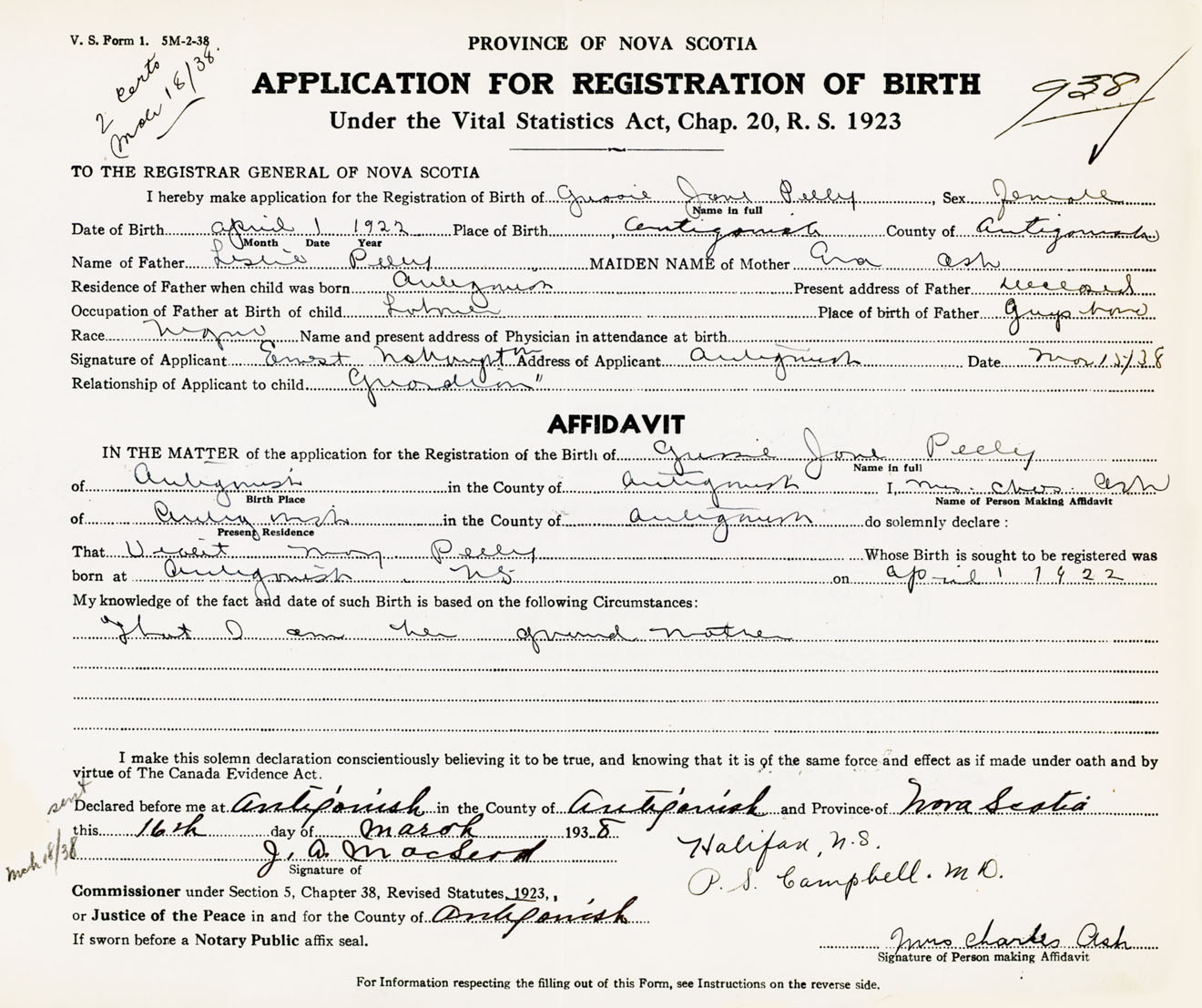 born at Antigonish Antigonish County on April 1, 1922