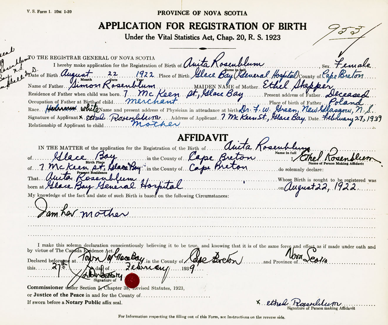 Signature of Applicant Ethel Rosenblum Address of Applicant 7 McKeen Street, Glace Bay, Cape Breton Co., NS Date 27 February 1939