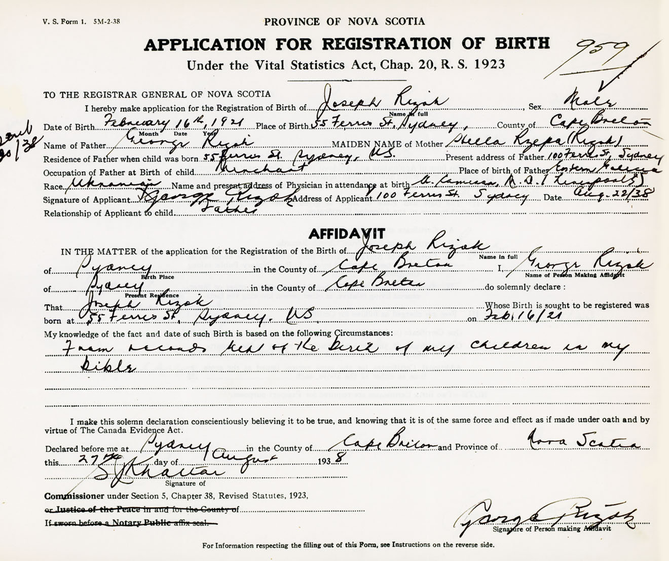 Signature of Applicant George Rizok Address of Applicant 100 Ferris Street, Sydney, Cape Breton Co., NS Date 22 August 1938