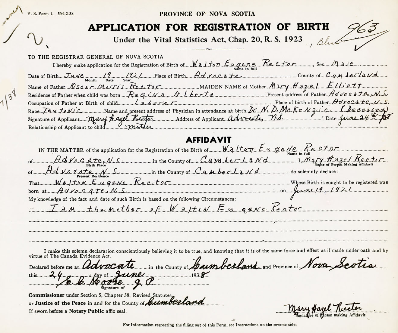 Signature of Applicant Mary Hazel Rector Address of Applicant Advocate, Cumberland Co., NS Date 24 June 1938