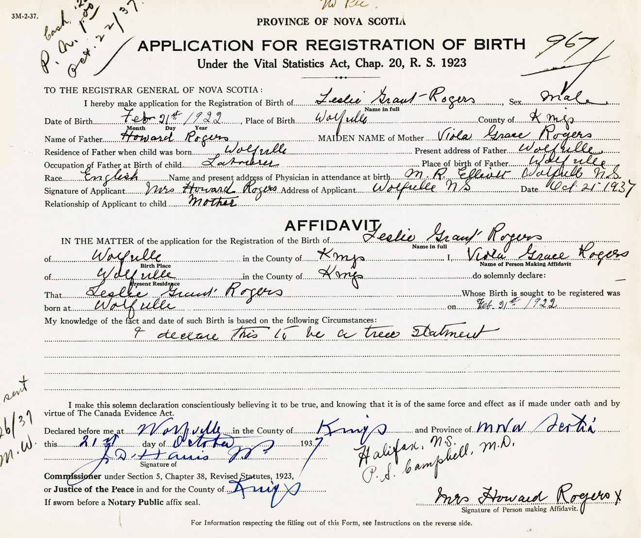 I hereby make application for the Registration of Birth of Leslie GrantRogers Sex Male