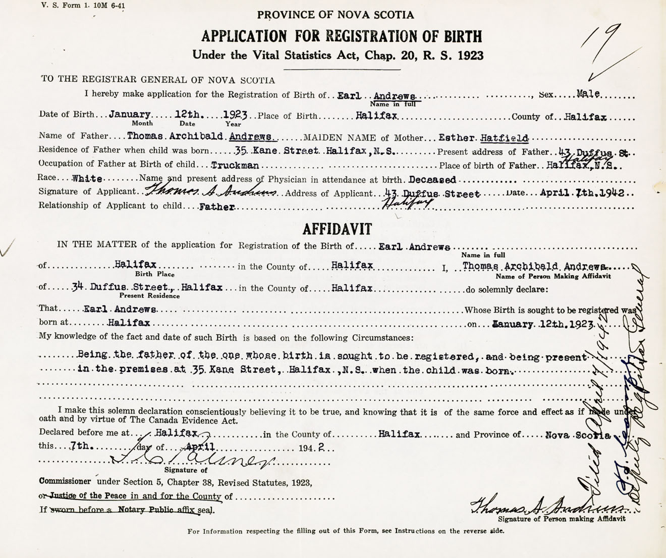Signature of Applicant Thomas A. Andrews Address of Applicant 43 Duffus Street, Halifax, NS Date 7 April 1942