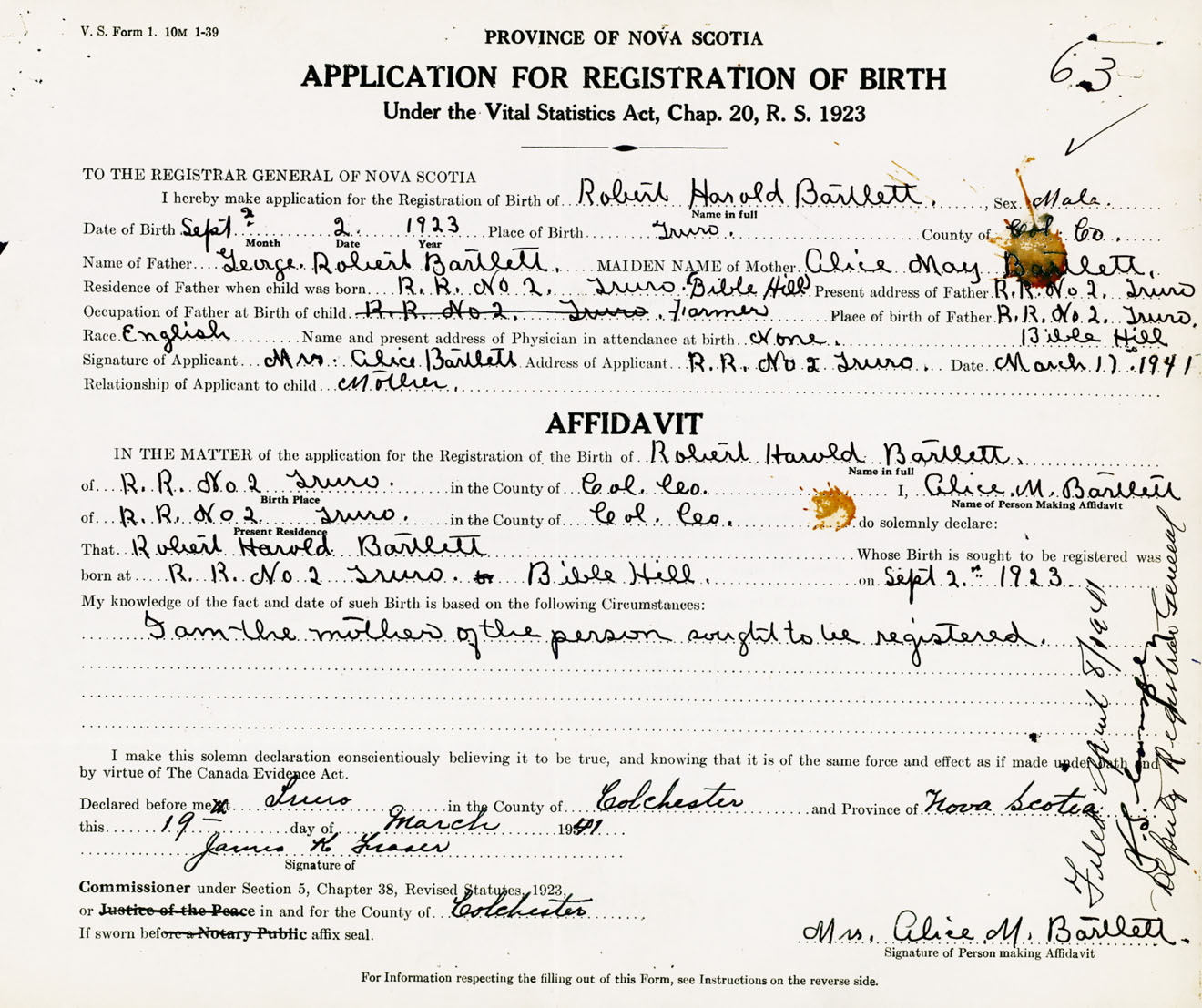 Signature of Applicant Mrs. Alice Bartlett Address of Applicant RR #2, Bible Hill, Truro, Colchester Co., NS Date 17 March 1941