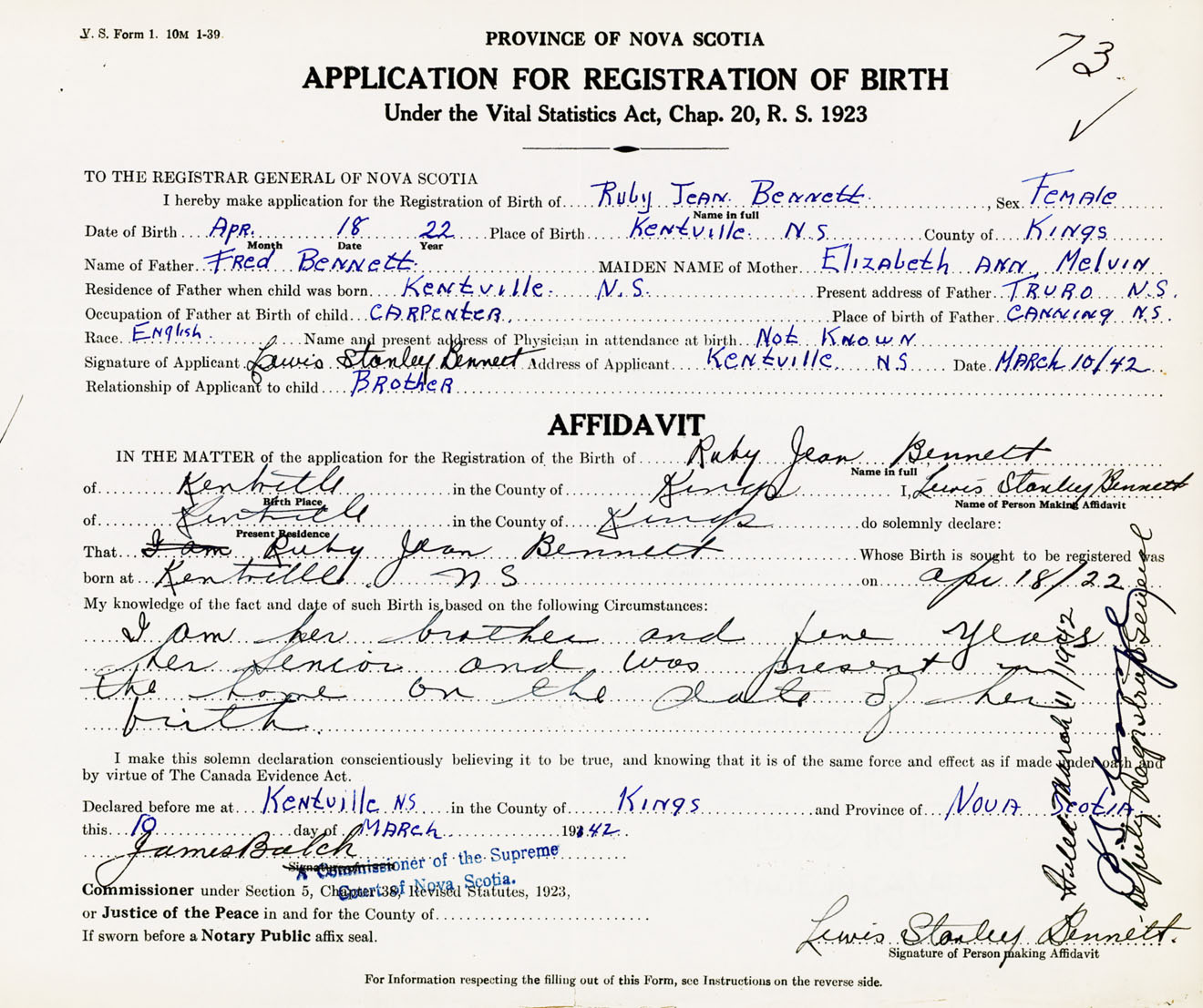 Signature of Applicant Lewis Stanley Bennett Address of Applicant Kentville, Kings Co., NS Date 10 March 1942