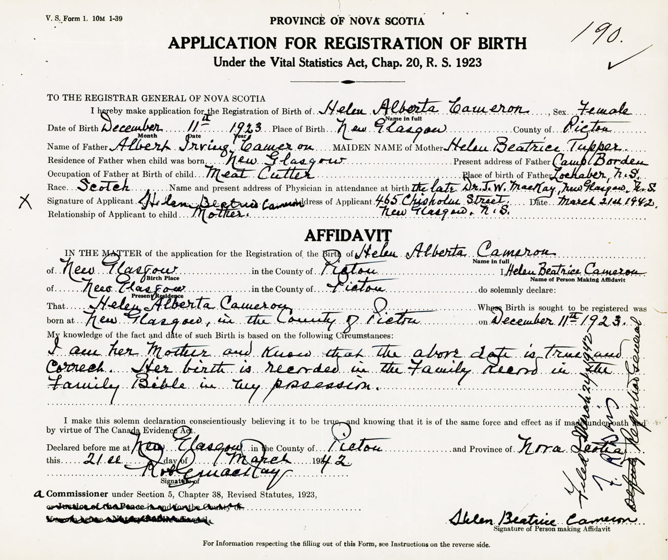 Signature of Applicant Helen Beatrice Cameron Address of Applicant 465 Chisholm Street, New Glasgow, Pictou Co., NS Date 21 March 1942