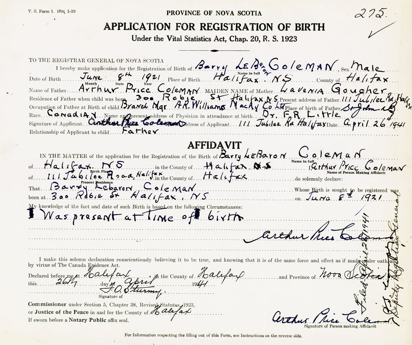 Signature of Applicant Arthur Rice Coleman Address of Applicant 111 Jubilee Road, Halifax, NS Date 26 April 1941