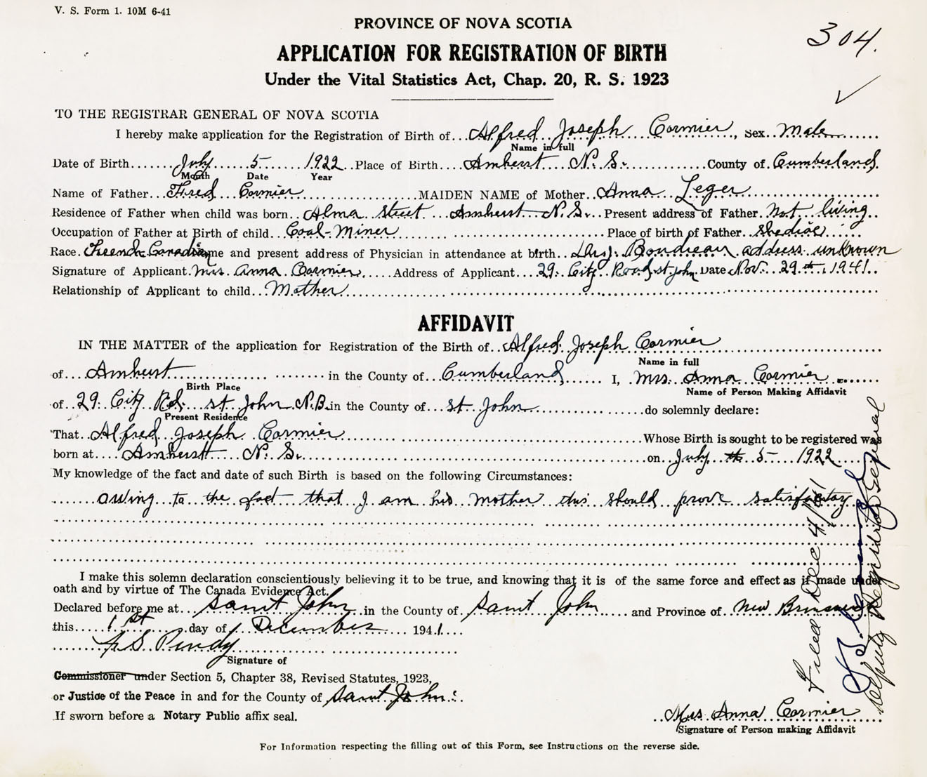 Signature of Applicant Mrs. Anna Cormier Address of Applicant 29 City Road, St. John, New Brunswick Date 29 November 1941