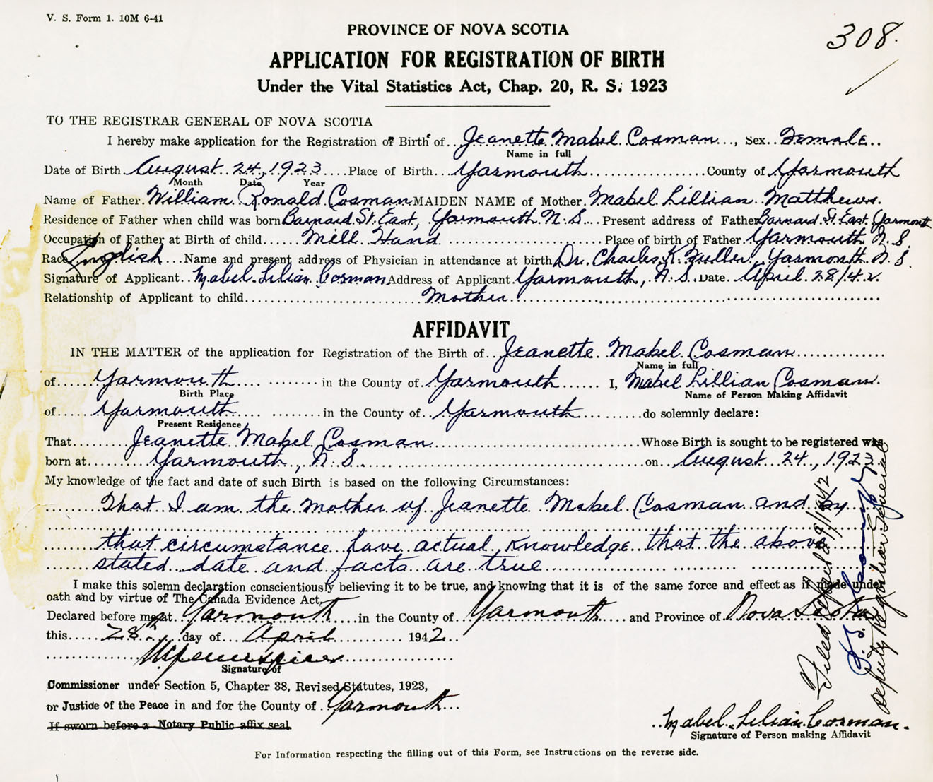 Signature of Applicant Mabel Lilian Cosman Address of Applicant Yarmouth, NS Date 28 April 1942