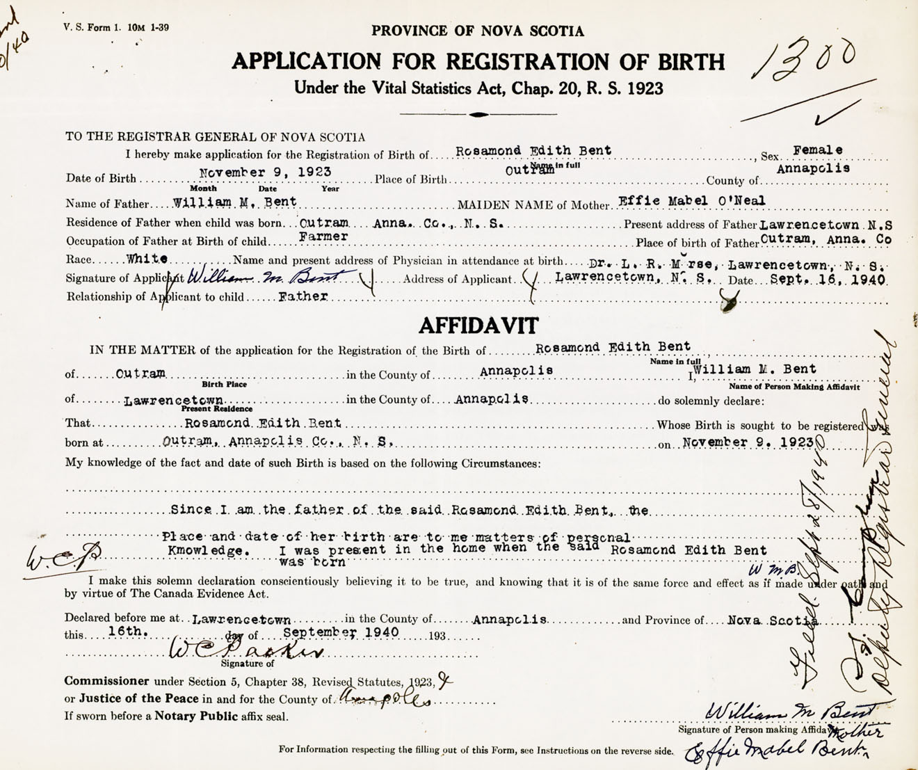 I hereby make application for the Registration of Birth of Rosamond EdithBent Sex Female