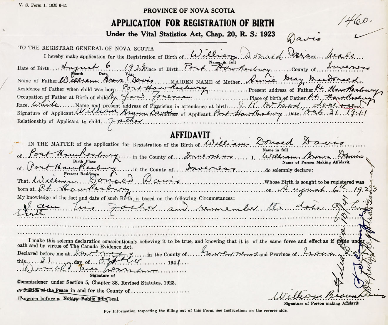 Signature of Applicant William Brown Davis Address of Applicant Port Hawkesbury, Inverness Co., NS Date 31 October 1941