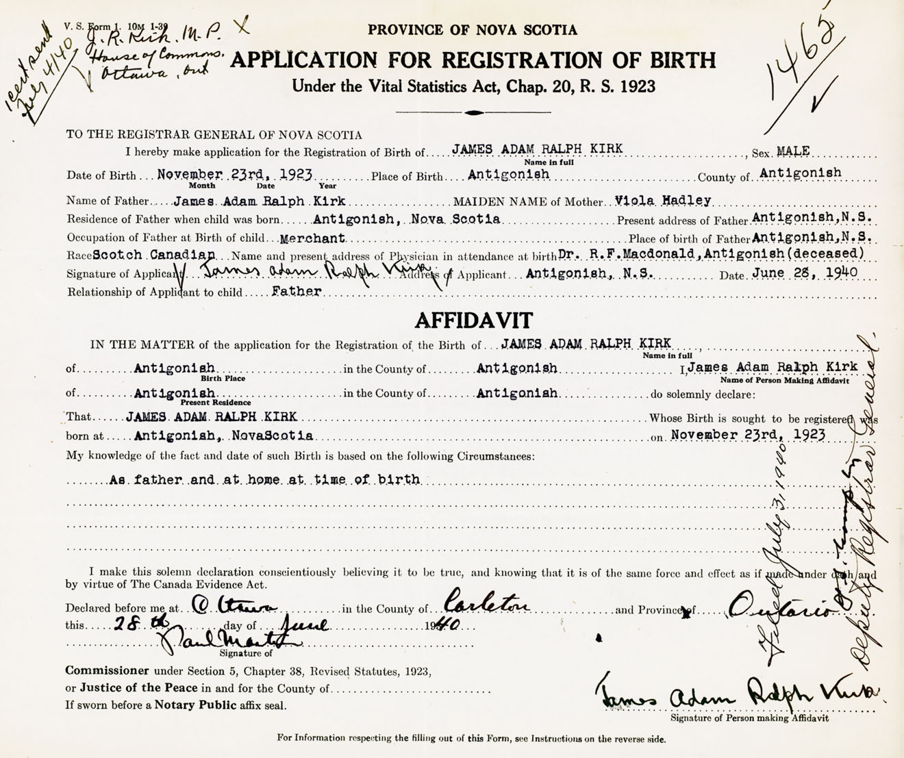 Signature of Applicant James Adam Ralph Kirk Address of Applicant Antigonish, NS Date 28 June 1940