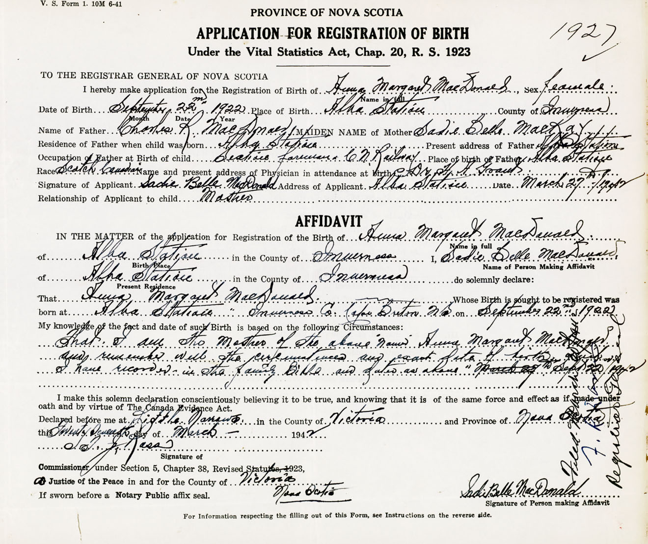 That I am the mother of the above named Anna Margaret MacDonald and remember well the circumstances and exact date of birth. I have record is in our family bible and dated as above.