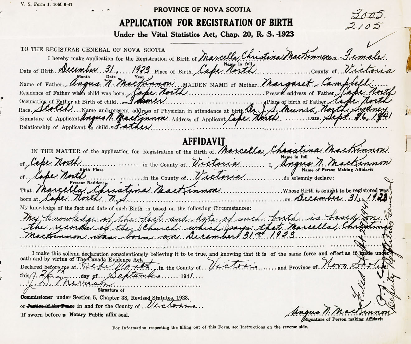 Signature of Applicant Angus N. MacKinnon Address of Applicant Cape North, Victoria Co., NS Date 26 September 1941