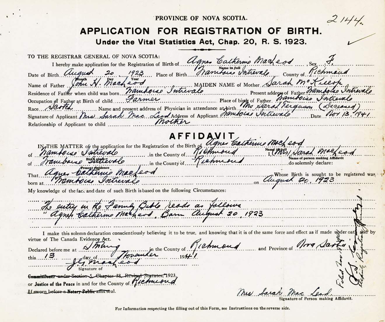 Signature of Applicant Mrs. Sarah MacLeod Address of Applicant Framboise Intervale, Richmond Co., NS Date 13 November 1941