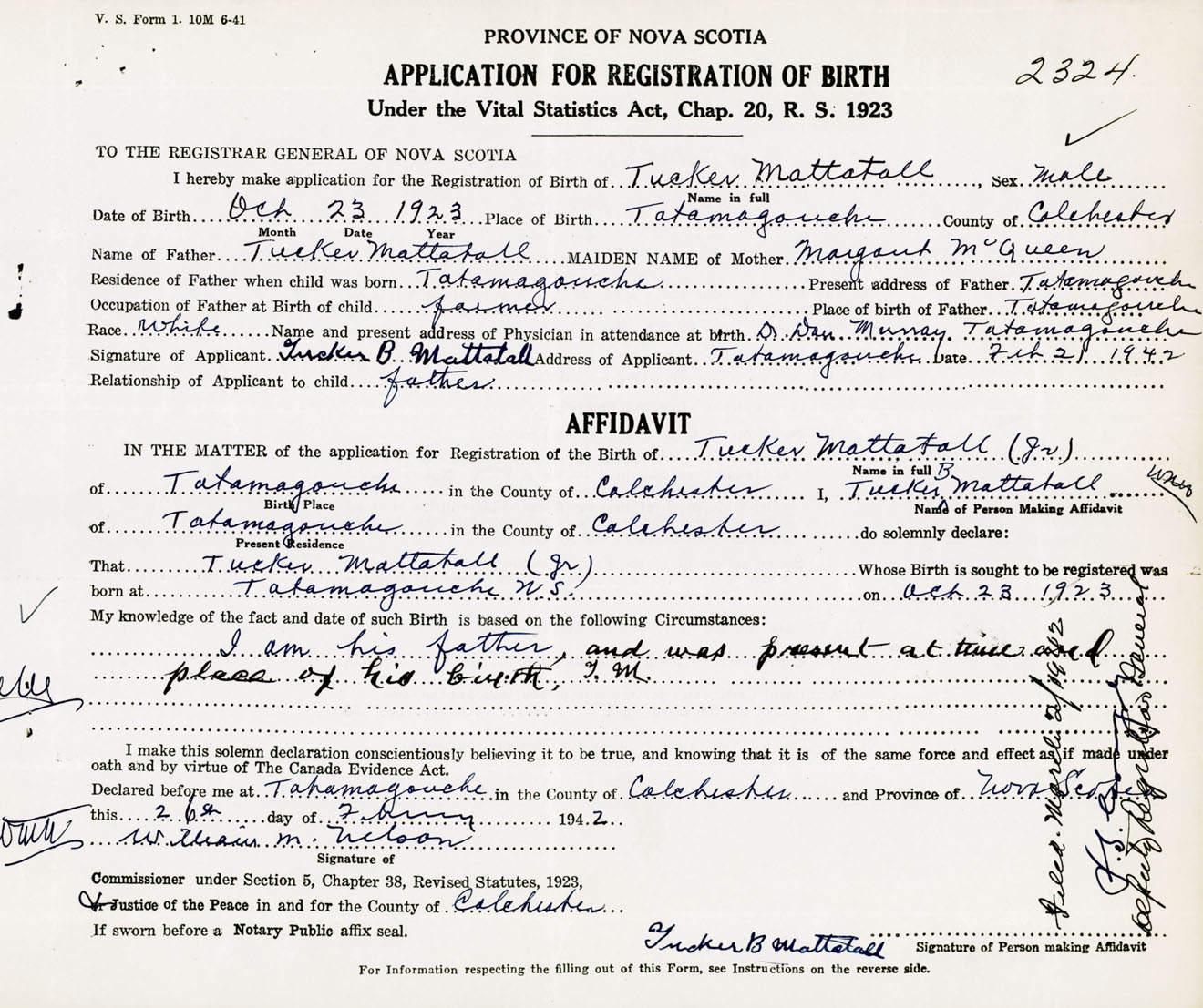 Signature of Applicant Tucker B. Mattatall Address of Applicant Tatamagouche, Colchester Co., NS Date 21 February 1942