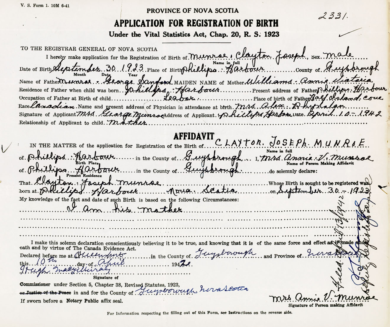 Signature of Applicant Mrs. George Munroe Address of Applicant Philips Harbour, Guysborough Co., NS Date 10 April 1942