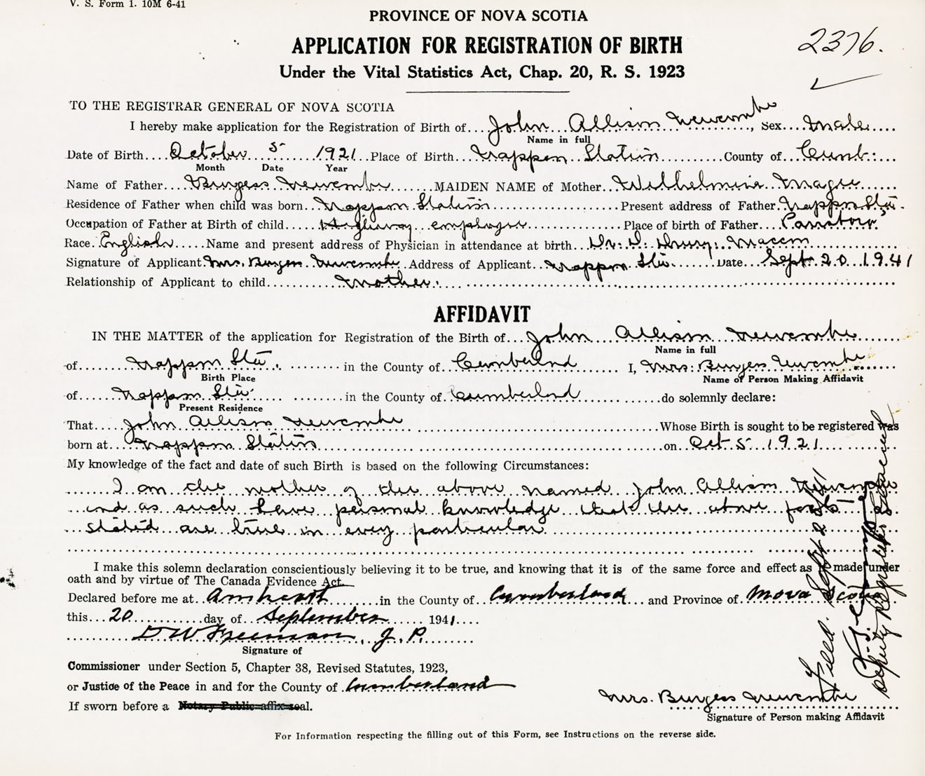 Date of Birth October 5, 1921 Place of Birth Nappan StationCounty of Cumberland