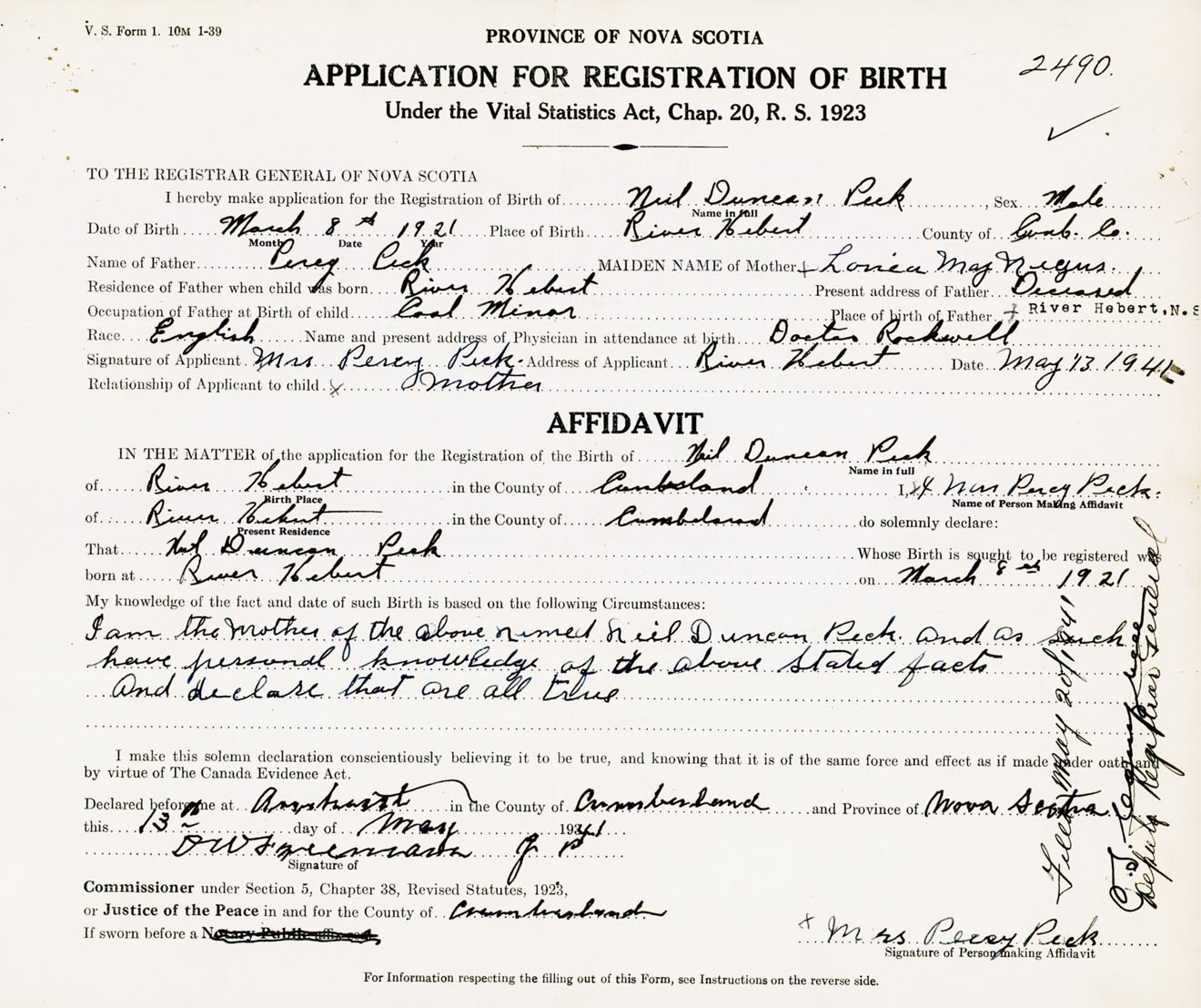 Signature of Applicant Mrs. Percy Peck Address of Applicant River Hebert, Cumberland Co., NS Date 13 May 1941