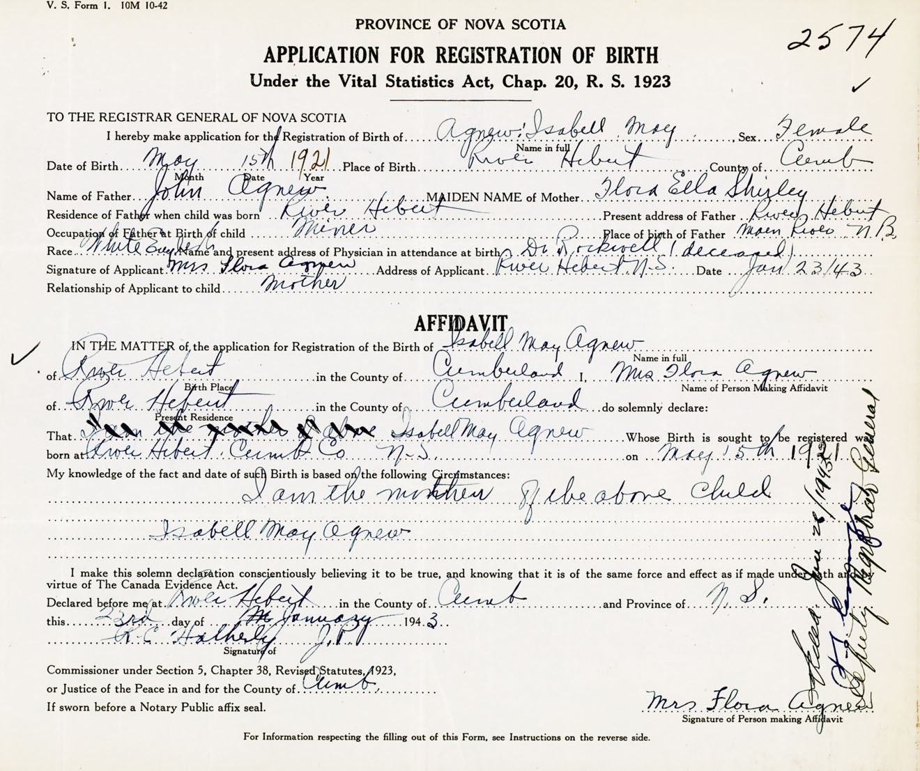 Signature of Applicant Mrs. Flora Agnew Address of Applicant River Hebert, Cumberland Co., NS Date 23 January 1943