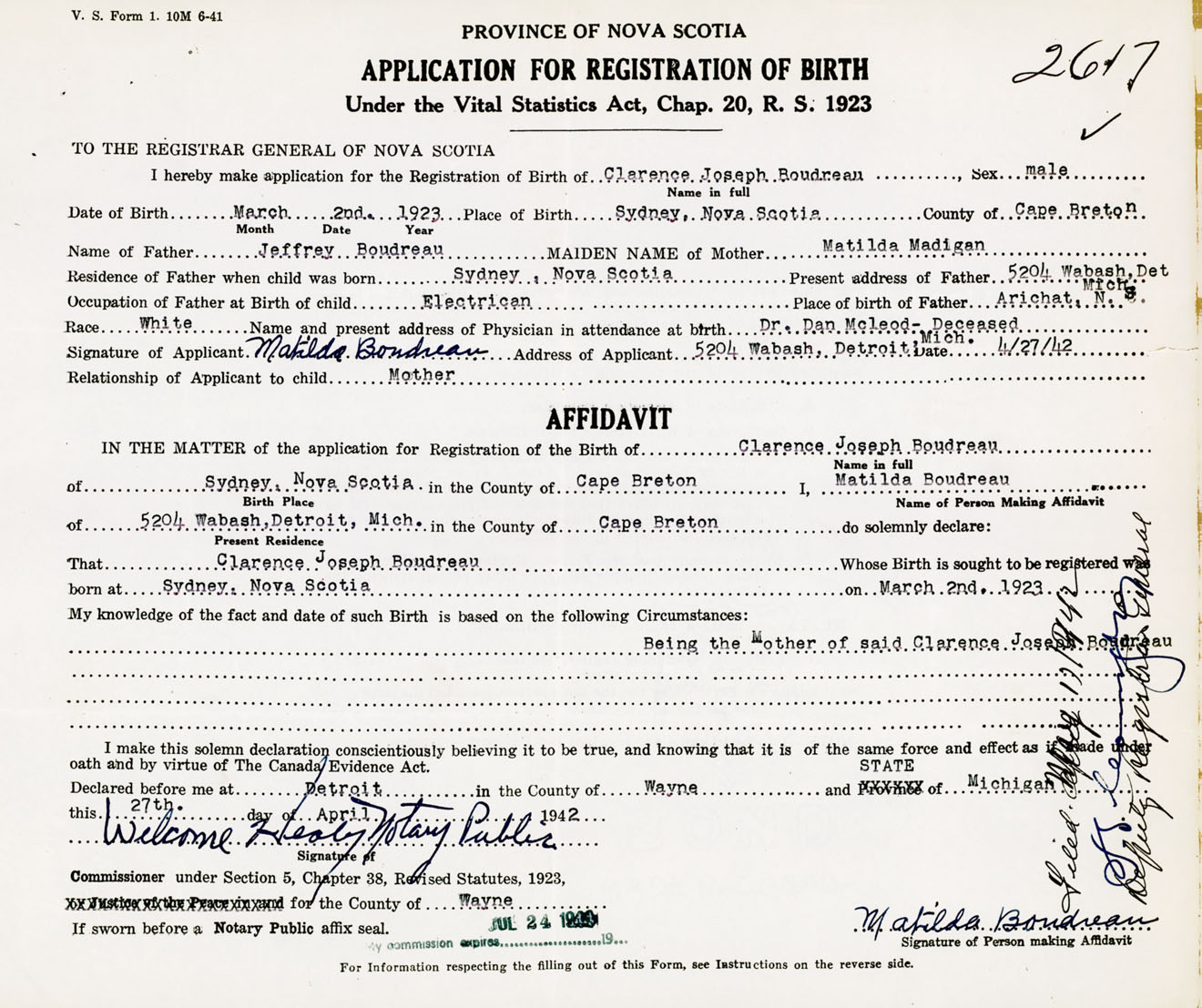 I hereby make application for the Registration of Birth of Clarence JosephBoudreau Sex Male