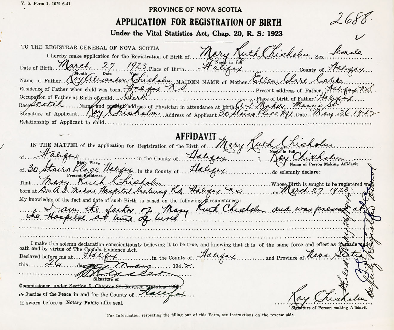 Signature of Applicant Roy Chisholm Address of Applicant 30 Stairs Place, Halifax, NS Date 26 May 1942