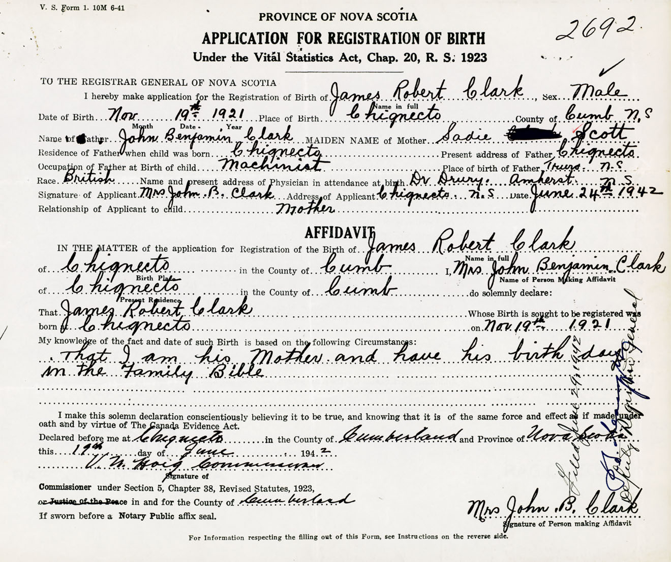 Signature of Applicant Mrs. John B. Clark Address of Applicant Chignecto, Cumberland Co., NS Date 24 June 1942