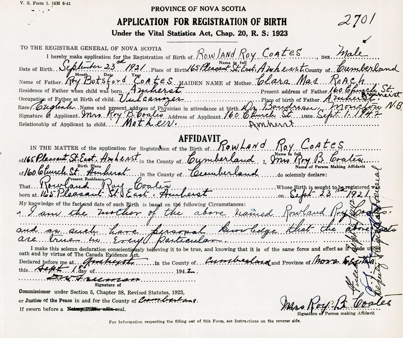 I hereby make application for the Registration of Birth of Rowland RoyCoates Sex Male