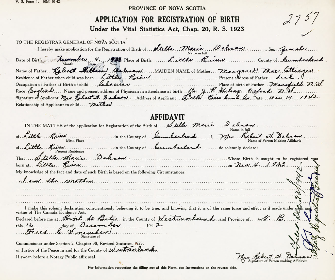 Signature of Applicant Mrs. Robert H. Dobson Address of Applicant Little River, Cumberland Co., NS Date 14 December 1942