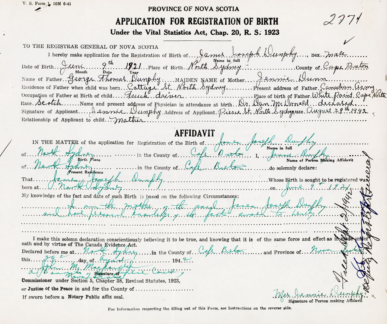 Signature of Applicant Jennie Dunphy Address of Applicant Pierre Street, North Sydney, Cape Breton Co., NS Date 29 August 1942