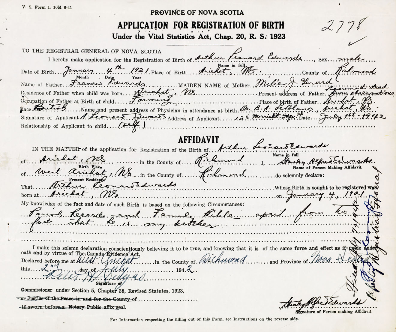 Signature of Applicant A. Leonard Edwards Address of Applicant 125 Morris Street, Halifax, NS Date 1 July 1942