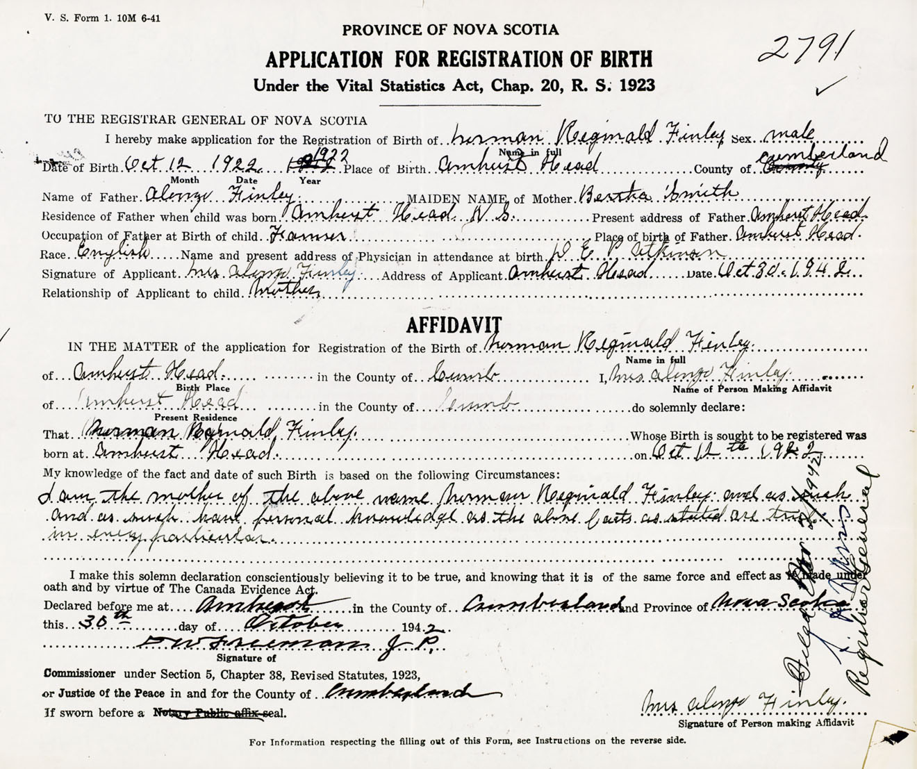 Signature of Applicant Mrs. Alonzo Finley Address of Applicant Amherst Head, Cumberland Co., NS Date 30 October 1942