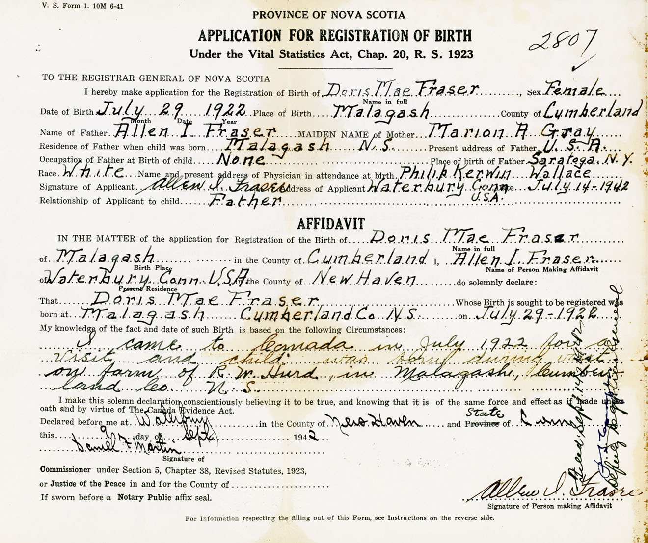 I came to Canada in July 1922 for a visit and child was born during visit on farm of R. W. Hurd in Malagash, Cumberland Co., NS