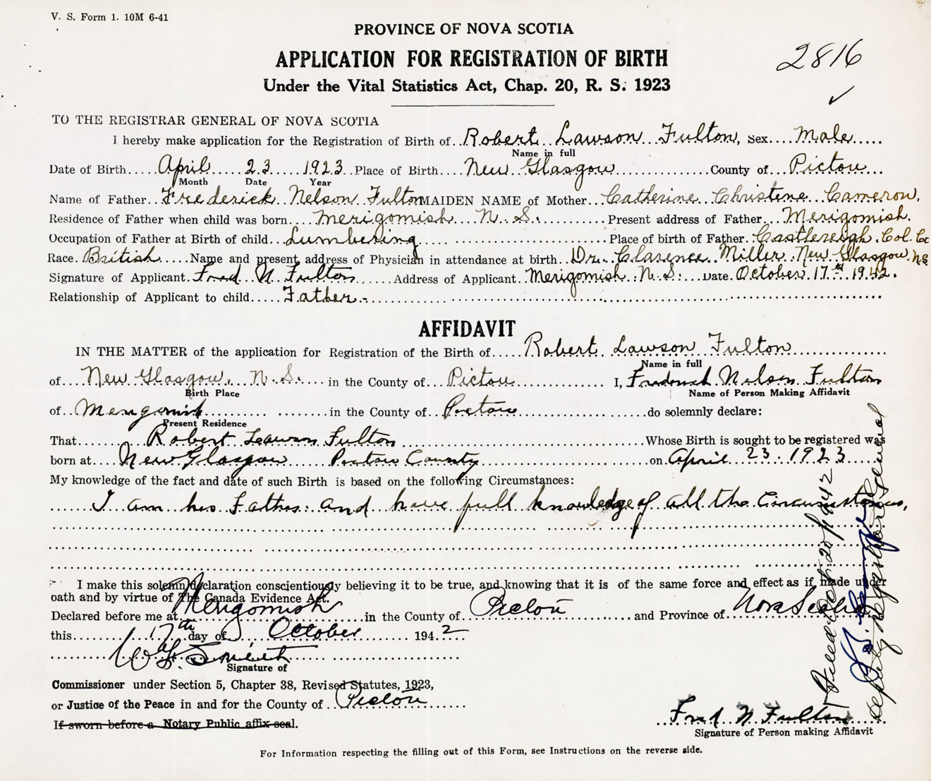 Signature of Applicant Fred N. Fulton Address of Applicant Merigomish, Pictou Co., NS Date 17 October 1942