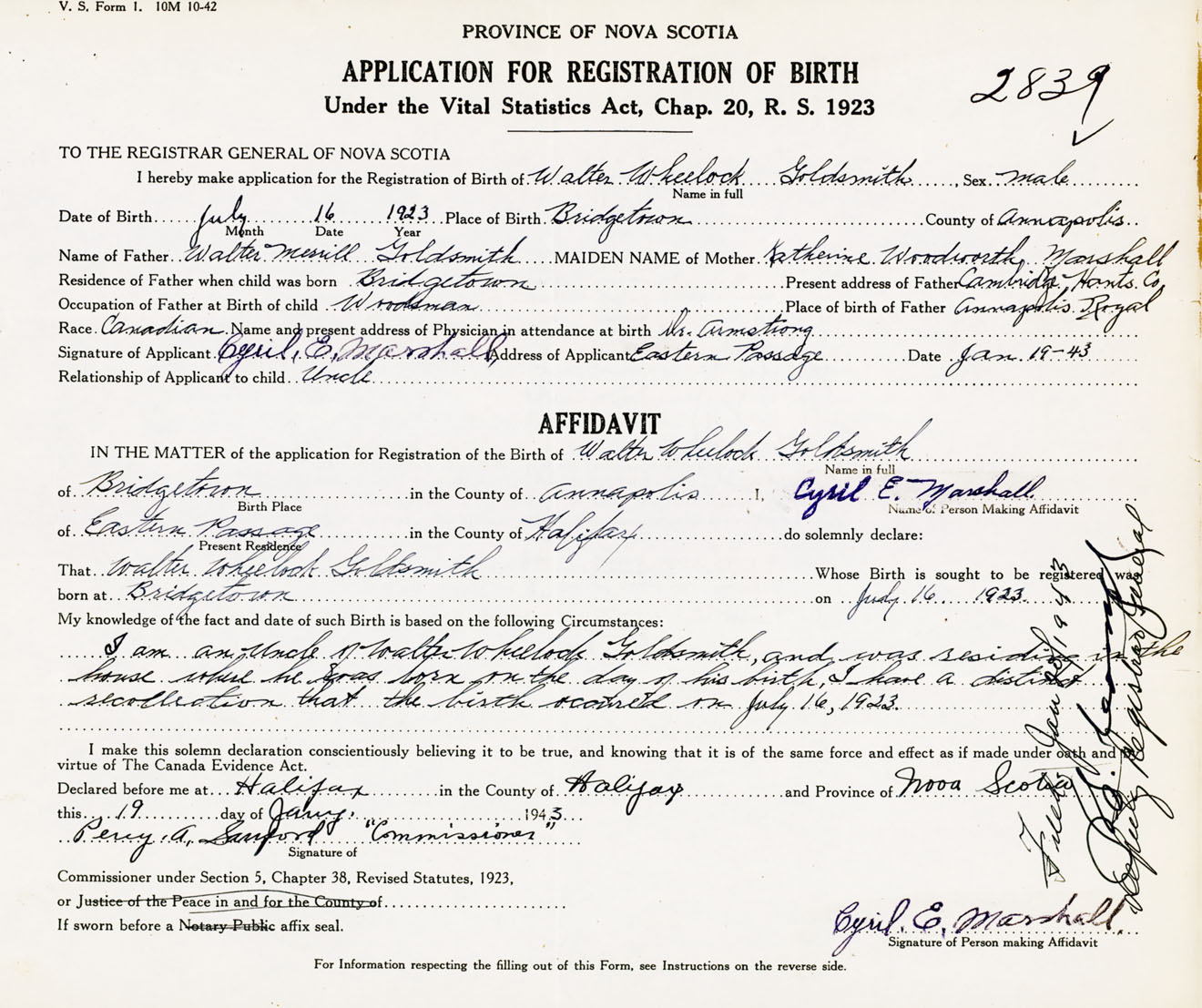 Signature of Applicant Cyril E. Marshall Address of Applicant Eastern Passage, Halifax Co., NS Date 19 January 1943