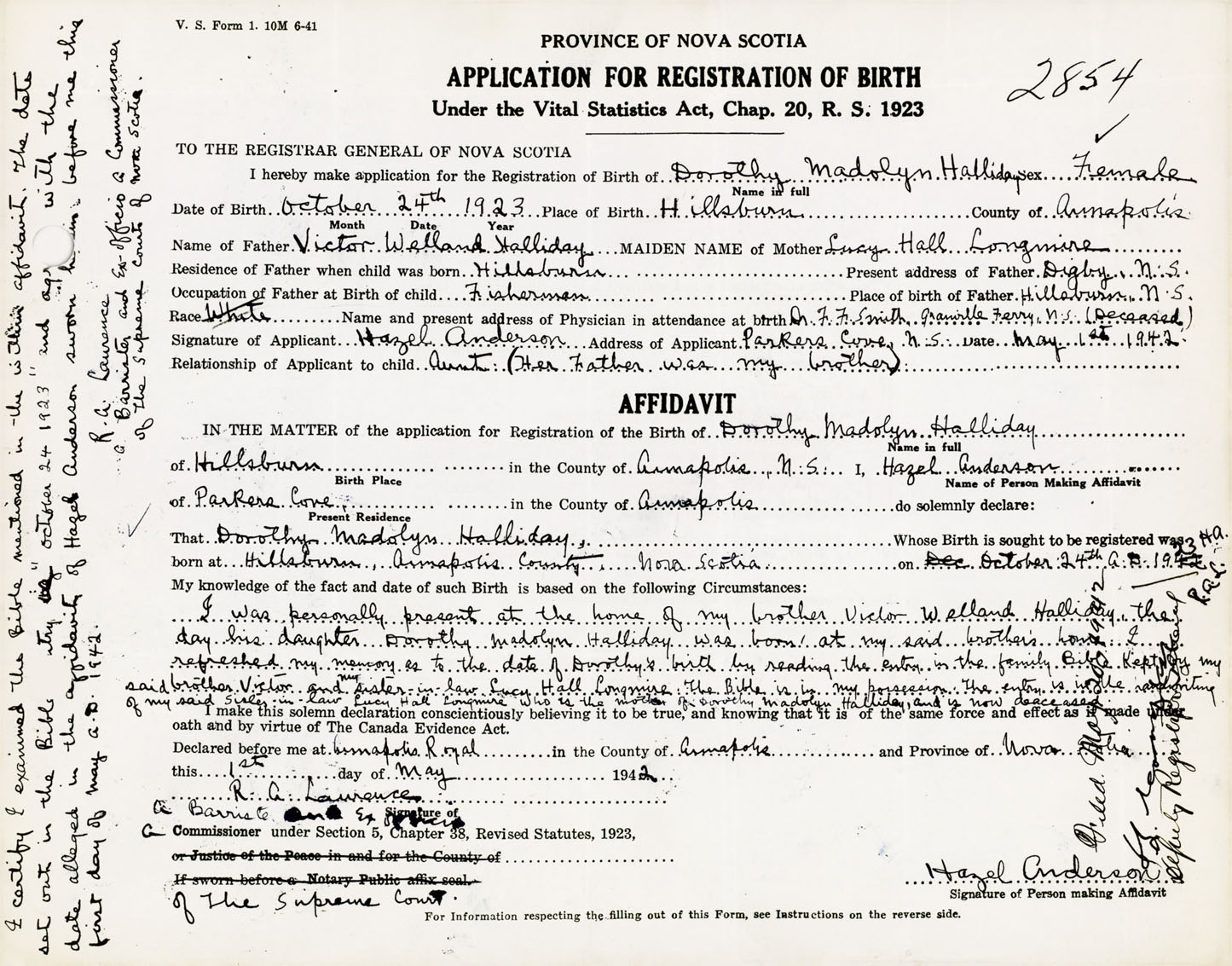 I was personally present at the home of my brother Victor Welland Halliday the day his daughter Dorothy Madolyn Halliday was born at my said brother's house. I refreshed my memory as to the date of Dorothy's birth by reading the entry in the family bible kept by my said brother Victor and my sister in law Lucy Hall Longmire. The bible is in my possession. the entry is in the handwriting of my said sister in law Lucy Hall Longmire who is the mother of Dorothy Madolyn Halliday and is now deceased.
