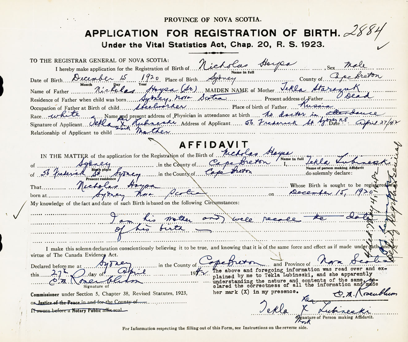 Signature of Applicant Tekla Lubineski Address of Applicant 56 Frederick Street, Sydney, Cape Breton Co., NS Date 27 April 1942