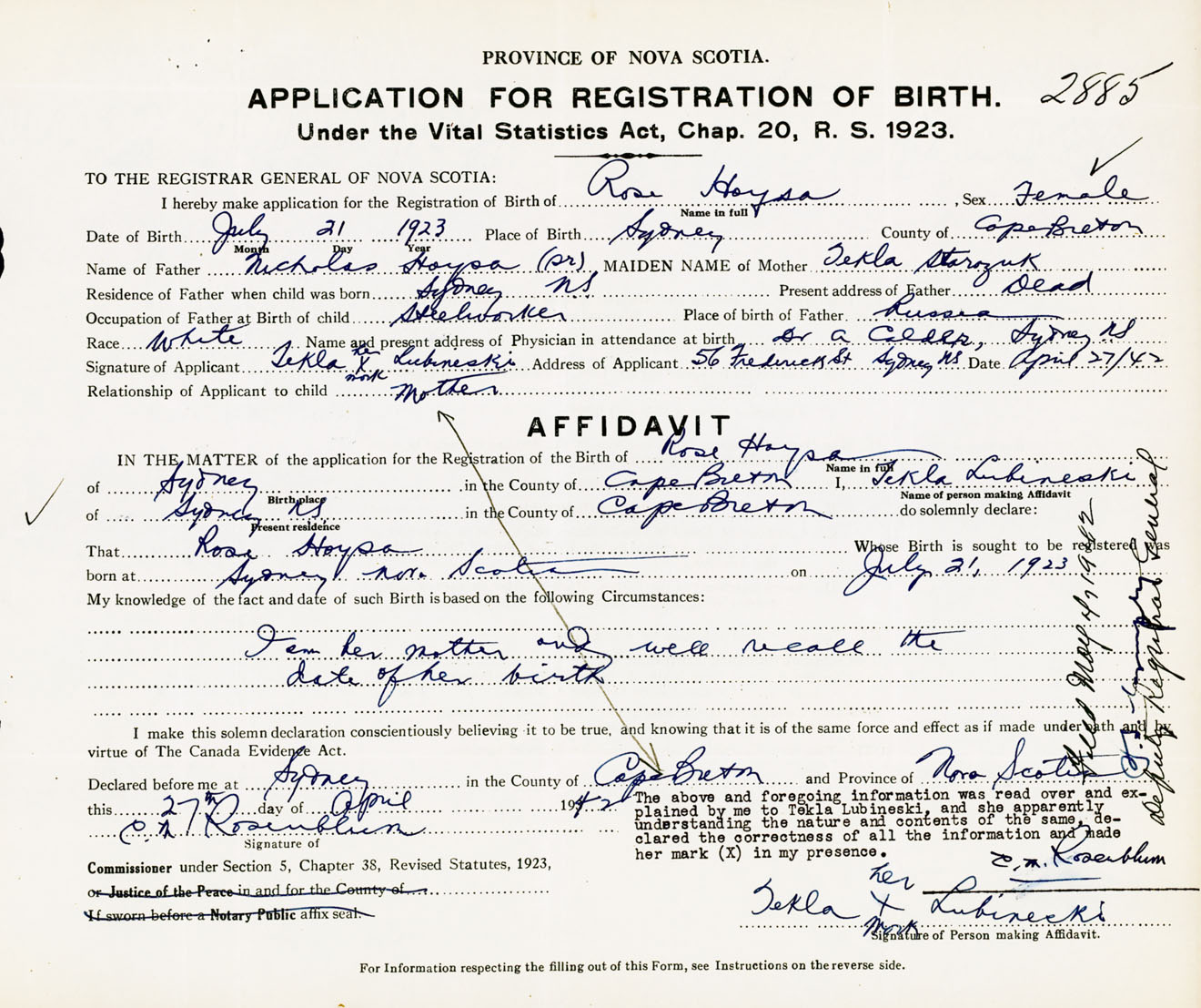 Signature of Applicant Tekla Lubineski Address of Applicant 56 Frederick Street, Sydney, Cape Breton Co., NS Date 27 April 1942