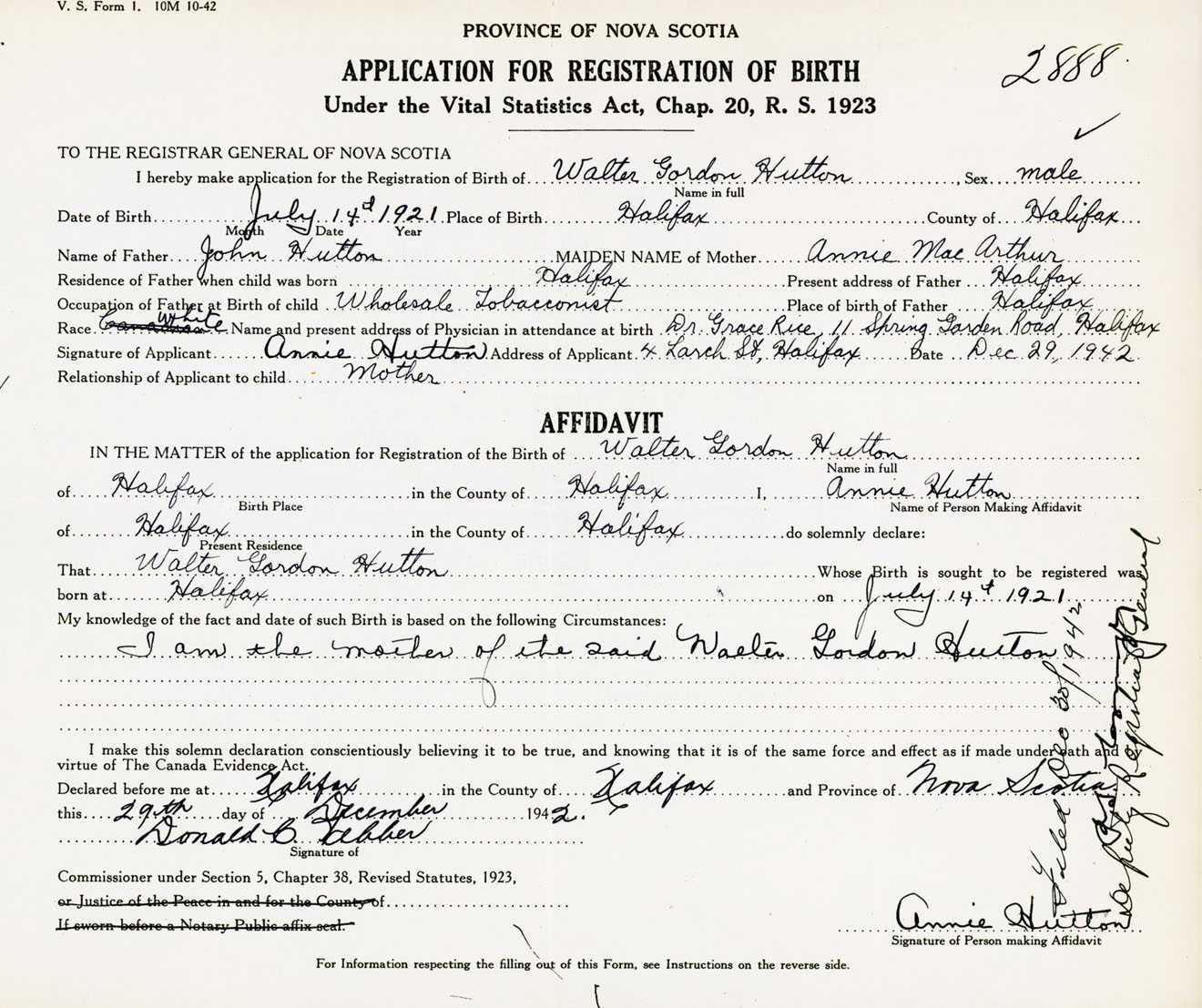 Signature of Applicant Annie Hutton Address of Applicant 4 Larch Street, Halifax, NS Date 29 December 1942