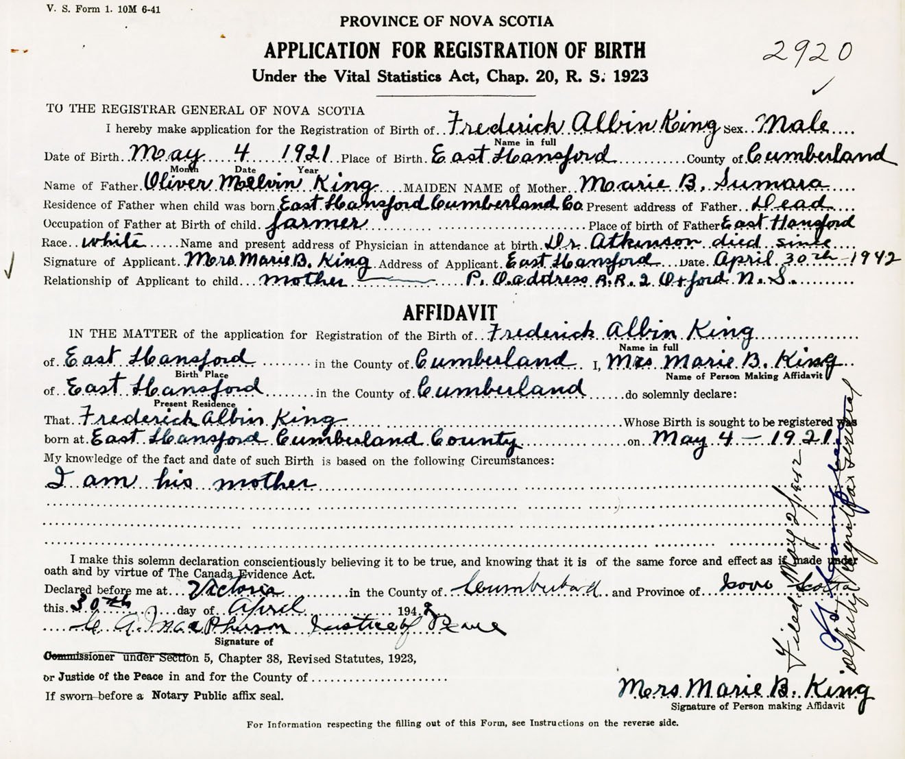 Signature of Applicant Mrs. Marie B. King Address of Applicant Cumberland Co., NS Date 30 April 1942