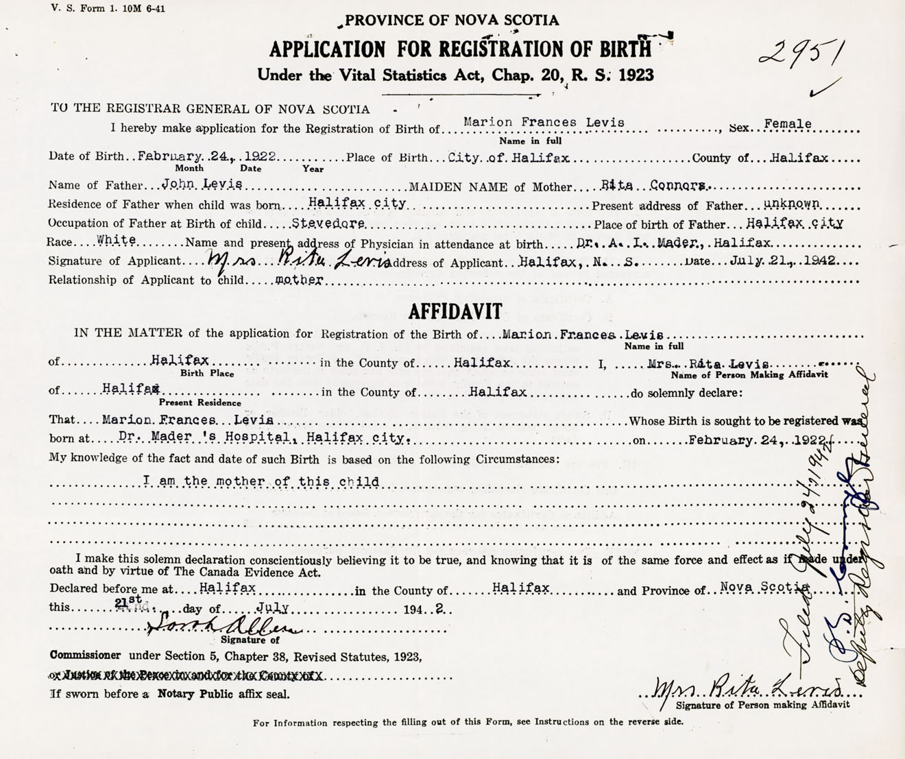 Signature of Applicant Mrs. Rita Levis Address of Applicant Halifax, NS Date 21 July 1942