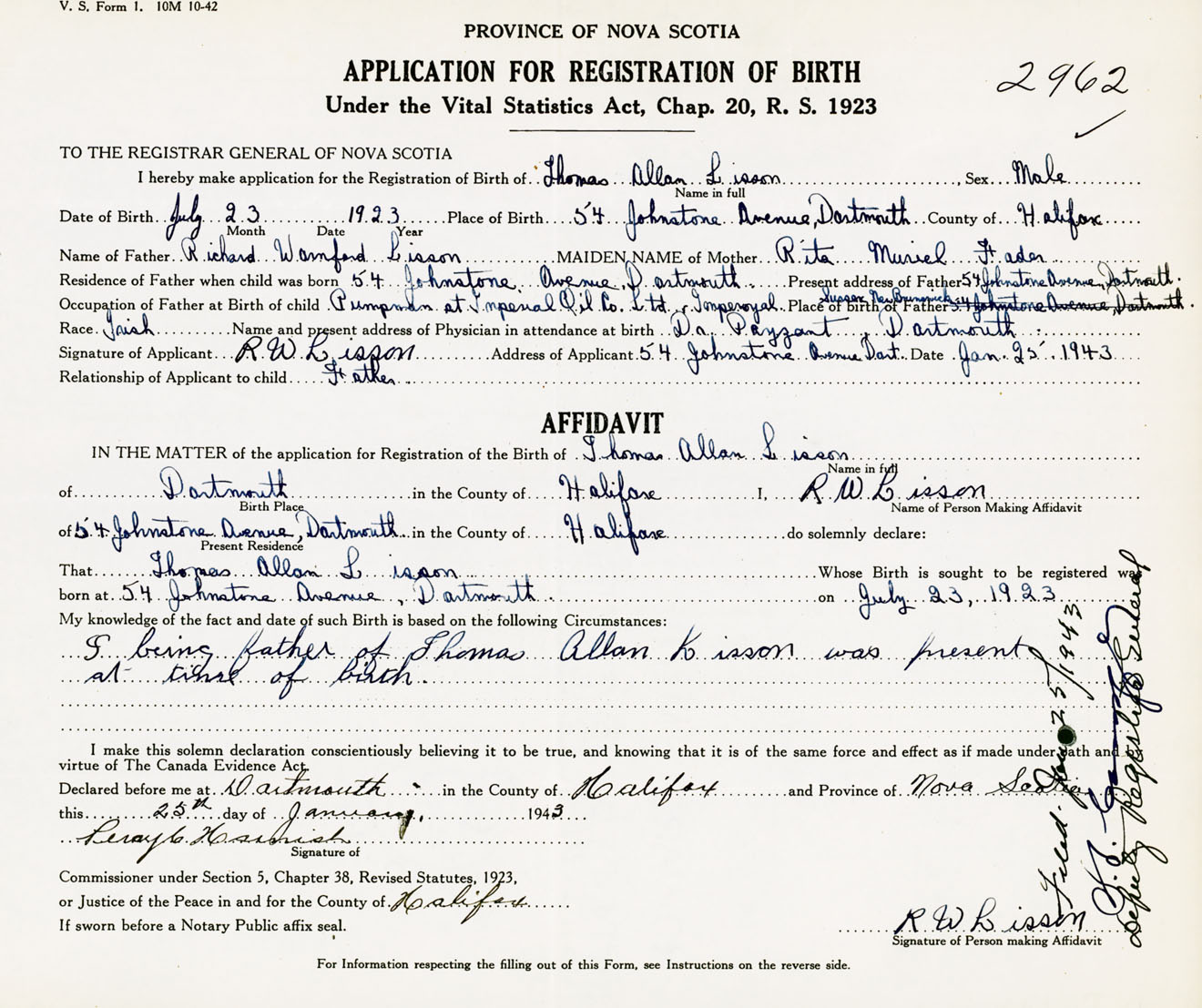 Born at 54 Johnstone Avenue, Dartmouth in the County of Halifax