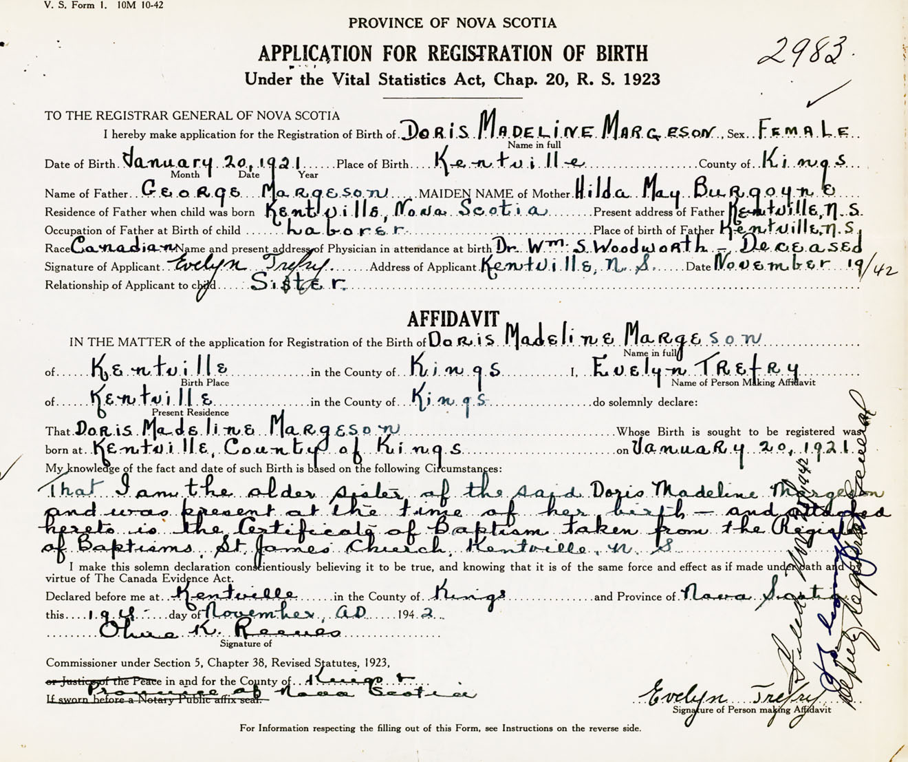 That I am the older sister of the said Doris Madeline Margeson and was present at the time of her birth and attached hereto is the certificate of baptism, taken from the register of baptisms, St. James Church, Kentville, Kings Co., NS